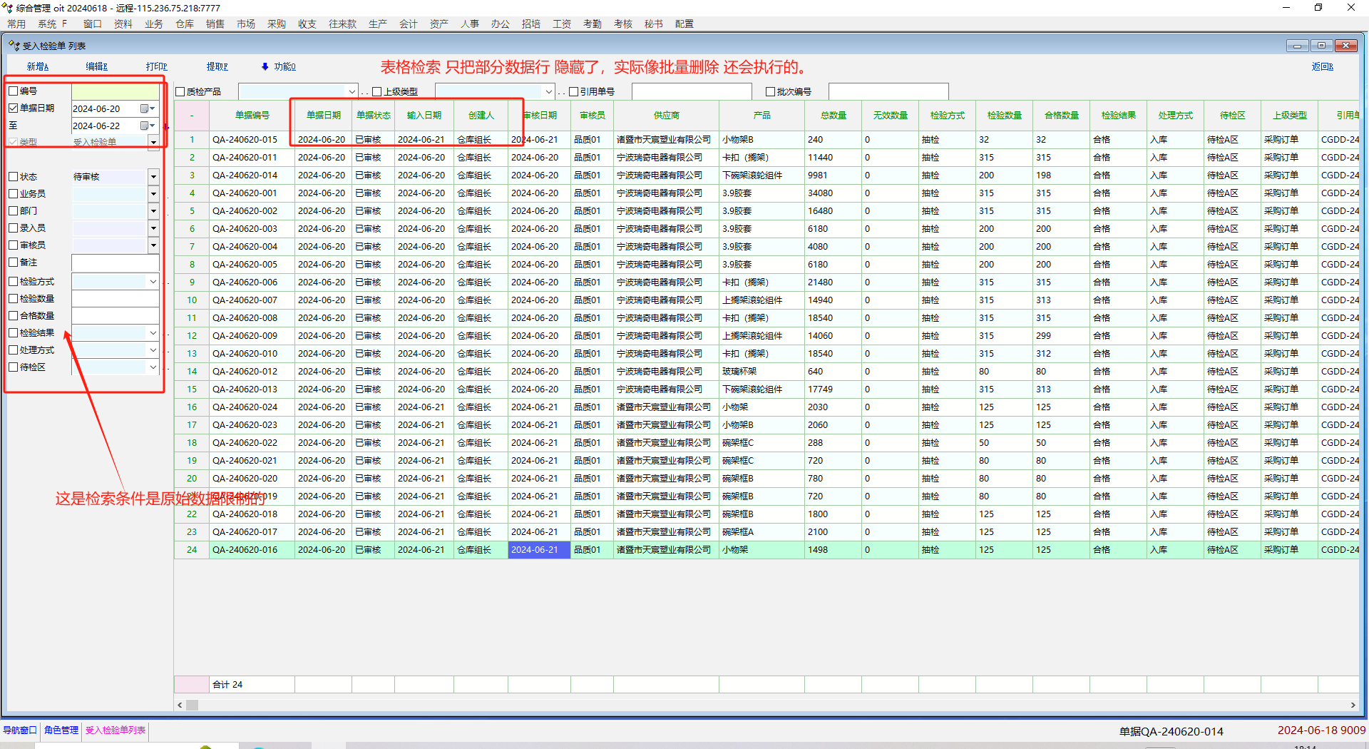 用户 单据清单里 表格筛选记录,批量删除造成全部数据误删除。用户操作习惯认为隐藏就不操作了。