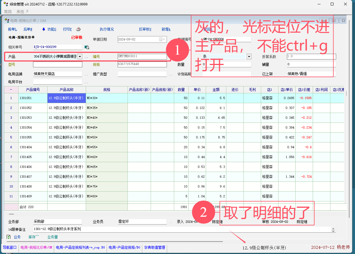 建议,审核之后, 主产品编号不可以编辑, 但是光标可以定位进并按ctrl+g打开产品卡片。方便快捷查看产品资料。