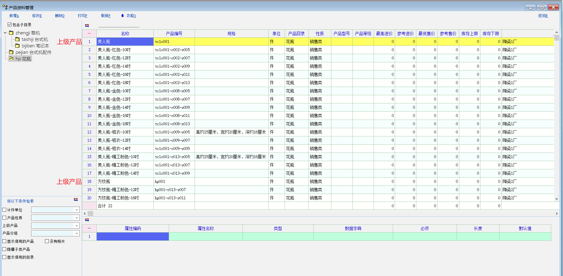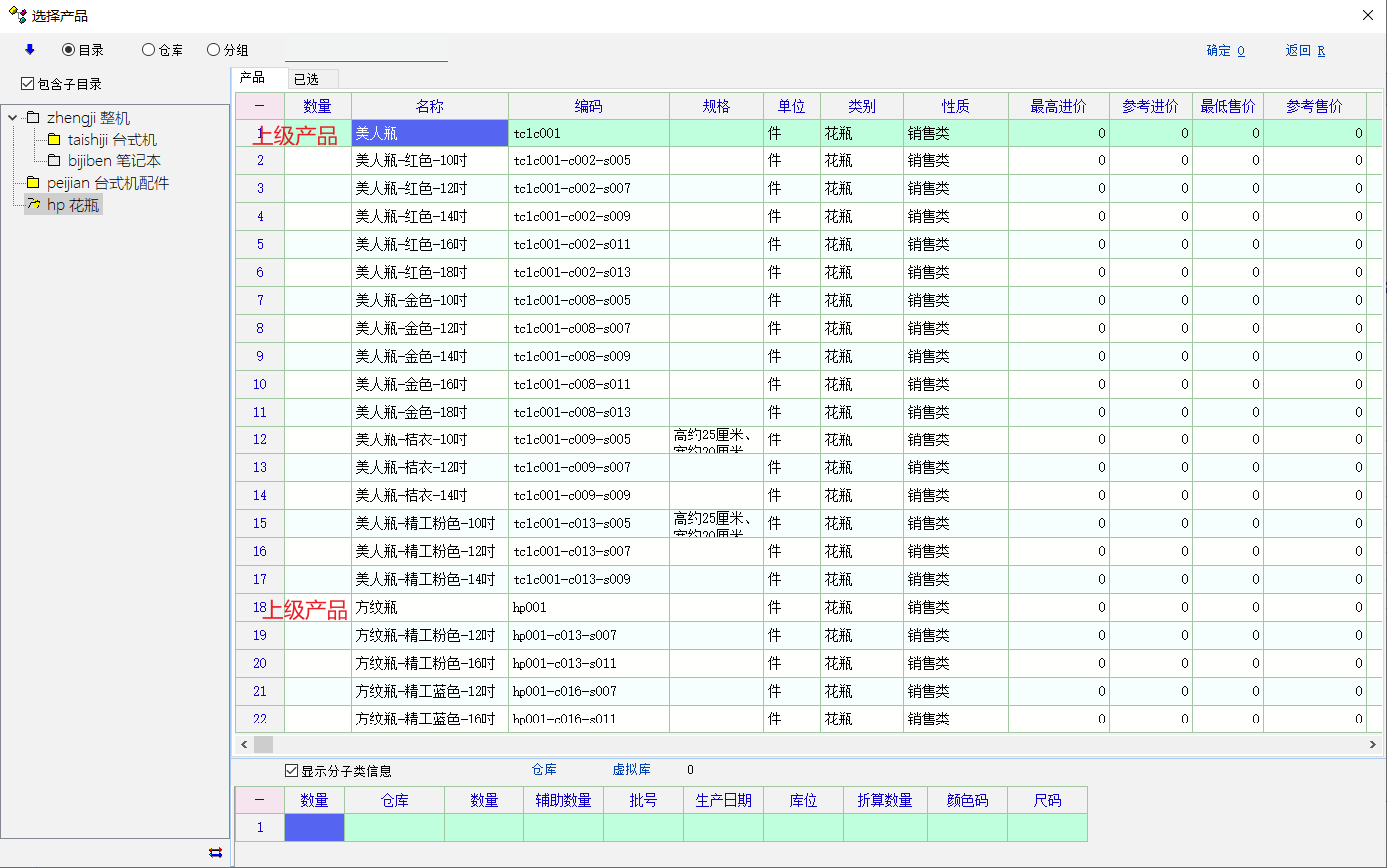 如下图所示,“美人瓶”与“方纹瓶”两个产品是上级产品,其他产品是下级产品,下级产品有尺寸和颜色,会几何级数的增长数量,产品一多,在寻找选择时会有很大的困难。 建议:在产品定义、物资单据等页面下,可以折叠下级产品,方便选择寻找产品。 这个功能感觉很重要,产品数量*尺寸数量*颜色数量,选择寻找产品是个恶梦。感谢! |