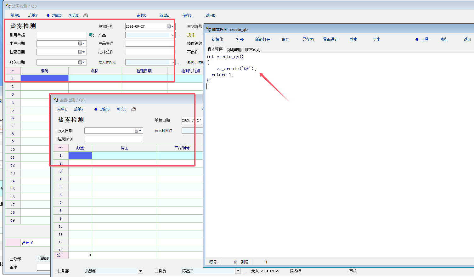 使用 脚本函数 vr_create 创建质检单据