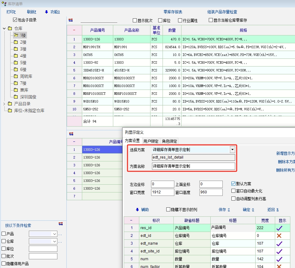 详细库存清单显示定制修改后无法保存结果。如图所示,宽度列更改宽度,保存方案后退出系统,下次再重新登录,显示的方案(宽度)又恢复为原来的方案(宽度)