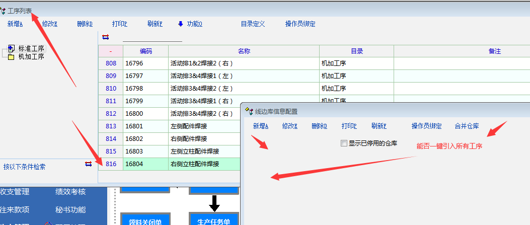 1、很多已经在使用生产工序的企业,不可能再去工序里面修改,所以建议:在线边仓里面设置一键引入所有工序,自动生成线边仓名称。