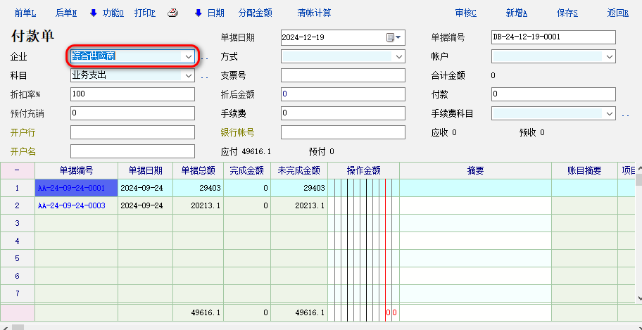 费用申请报销时,是根据《采购订单》打印一张《付款单》,而不是一家供应商就打印一份《付款单》
