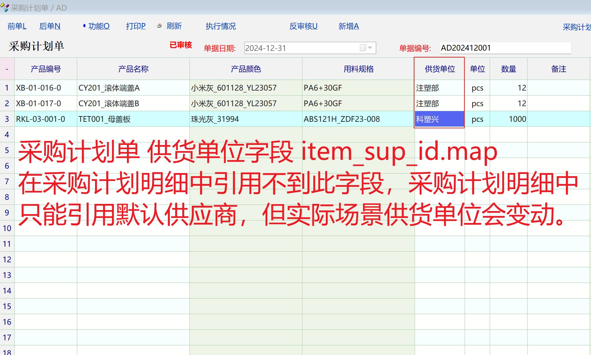 求助_采购计划明细中引用不到采购计划单中的供货单位 item_sup_id.map 字段_产供销