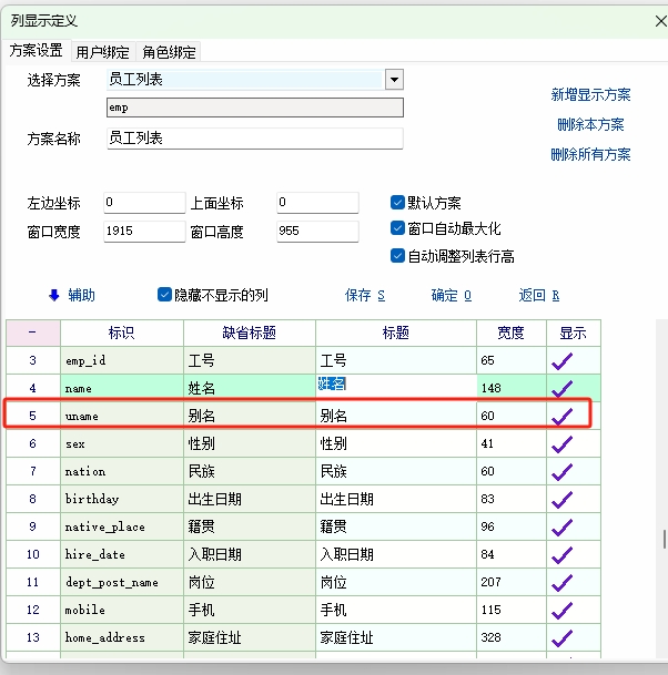 老师,希望在所有出现员工姓名的显示方案中同时有员工别名能显示出来,具体是国内考勤机不支持越南文,需要把姓名设置为英文,用来同步到考勤机,把别名设置为越南文,用来在各种操作界面和报表明细中显示出来