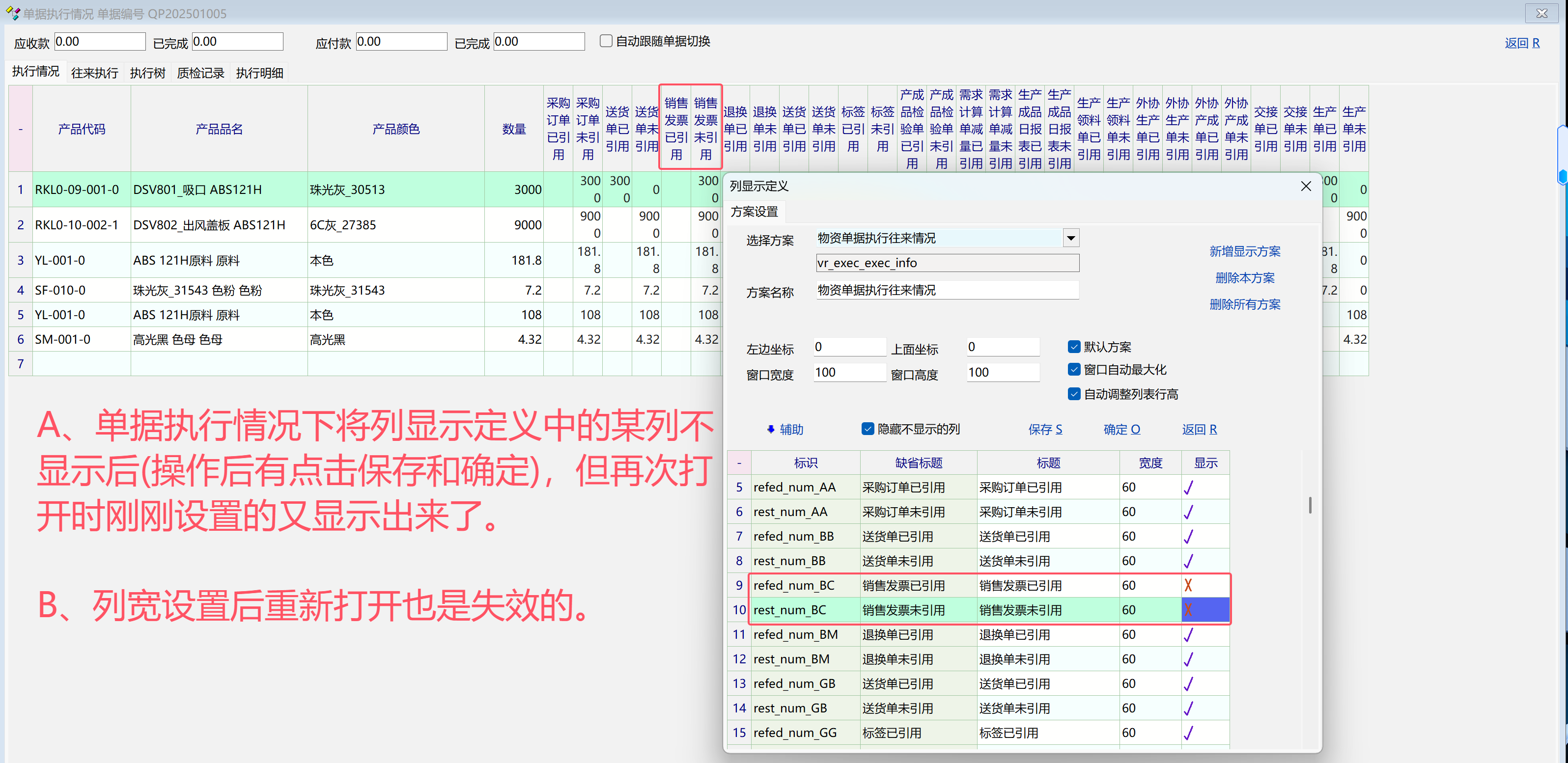 求助_单据执行情况中对某列设置不显示后,但重新打开时设置无效_产供销