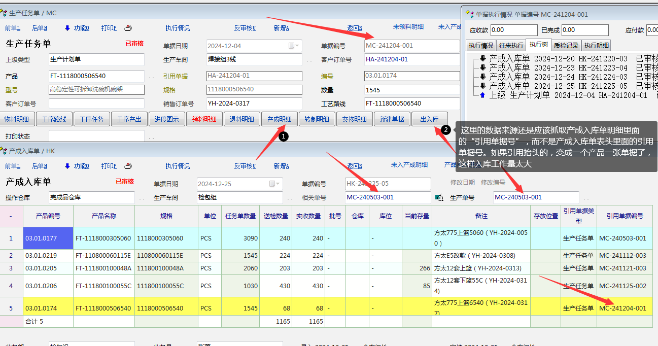 问题点:生产单里面的产成入库单里面的数据----目前是抓取产成入库单抬头里面的引用单据编号来抓取数据