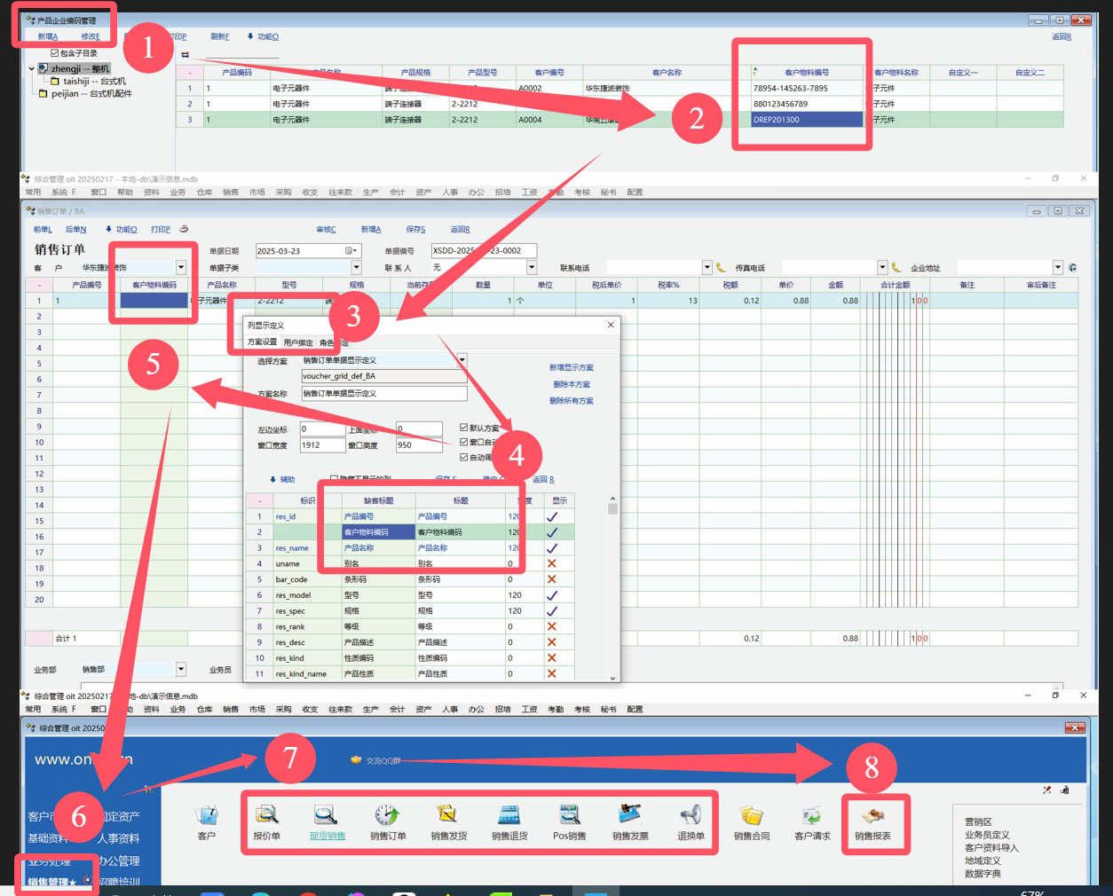 二、另一个思路:客户物料编码字段在销售订单及其它销售管理模块中的列显示定义中增设出来,做销售订单的时候客户物料编码能一次性手动录入,后续终身自动记忆带出,这个更加理想,谢谢。