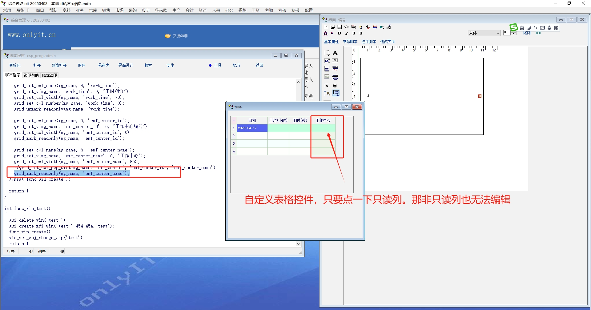 int func_win_create() { change_to_win('test-'); gui_create_grid('this','Grid',8,18); gui_set_w('Grid',401); gui_set_h('Grid',251); string mg_name; mg_name="Grid"; grid_set_col_num(mg_name, 7); //第一列 grid_set_col_width(mg_name, grid_get_col_name(mg_name, 0), 20); grid_set_col_name(mg_name, 1, 'rec_id'); grid_set_v(mg_name, 'rec_id', 0, "序号"); grid_set_col_width(mg_name, 'rec_id', 0); grid_mark_readonly(mg_name, 'rec_id'); //grid_set_col_align_middle(mg_name, 'emf_center_id'); grid_set_col_name(mg_name, 2, 'emf_center_date'); grid_set_v(mg_name, 'emf_center_date', 0, "日期"); grid_set_col_width(mg_name, 'emf_center_date', 100); grid_set_col_date(mg_name, 'emf_center_date'); grid_unmark_readonly(mg_name, 'emf_center_date'); grid_set_col_name(mg_name, 3, 'work_time_hour'); grid_set_v(mg_name, 'work_time_hour', 0, "工时(小时)"); grid_set_col_width(mg_name, 'work_time_hour', 70); grid_set_col_number(mg_name, "work_time_hour", 2); grid_unmark_readonly(mg_name, "work_time_hour"); grid_set_col_name(mg_name, 4, 'work_time'); grid_set_v(mg_name, 'work_time', 0, "工时(秒)"); grid_set_col_width(mg_name, 'work_time', 70); grid_set_col_number(mg_name, "work_time", 0); grid_unmark_readonly(mg_name, "work_time"); grid_set_col_name(mg_name, 5, 'emf_center_id'); grid_set_v(mg_name, 'emf_center_id', 0, "工作中心编号"); grid_set_col_width(mg_name, 'emf_center_id', 0); grid_mark_readonly(mg_name, 'emf_center_id'); grid_set_col_name(mg_name, 6, 'emf_center_name'); grid_set_v(mg_name, 'emf_center_name', 0, "工作中心"); grid_set_col_width(mg_name, 'emf_center_name', 80); //grid_set_col_pop_dict(mg_name, 'emf_center', 'emf_center_id', 'emf_center_name'); grid_mark_readonly(mg_name, 'emf_center_name'); //msg('func_win_create'); return 1; }; int func_win_test() { gui_delete_win('test-'); gui_create_mdi_win('test-',454,454,'test'); func_win_create() win_set_obj_change_csp('test'); return 1; }; int main() { func_win_test() return 1; }; |
