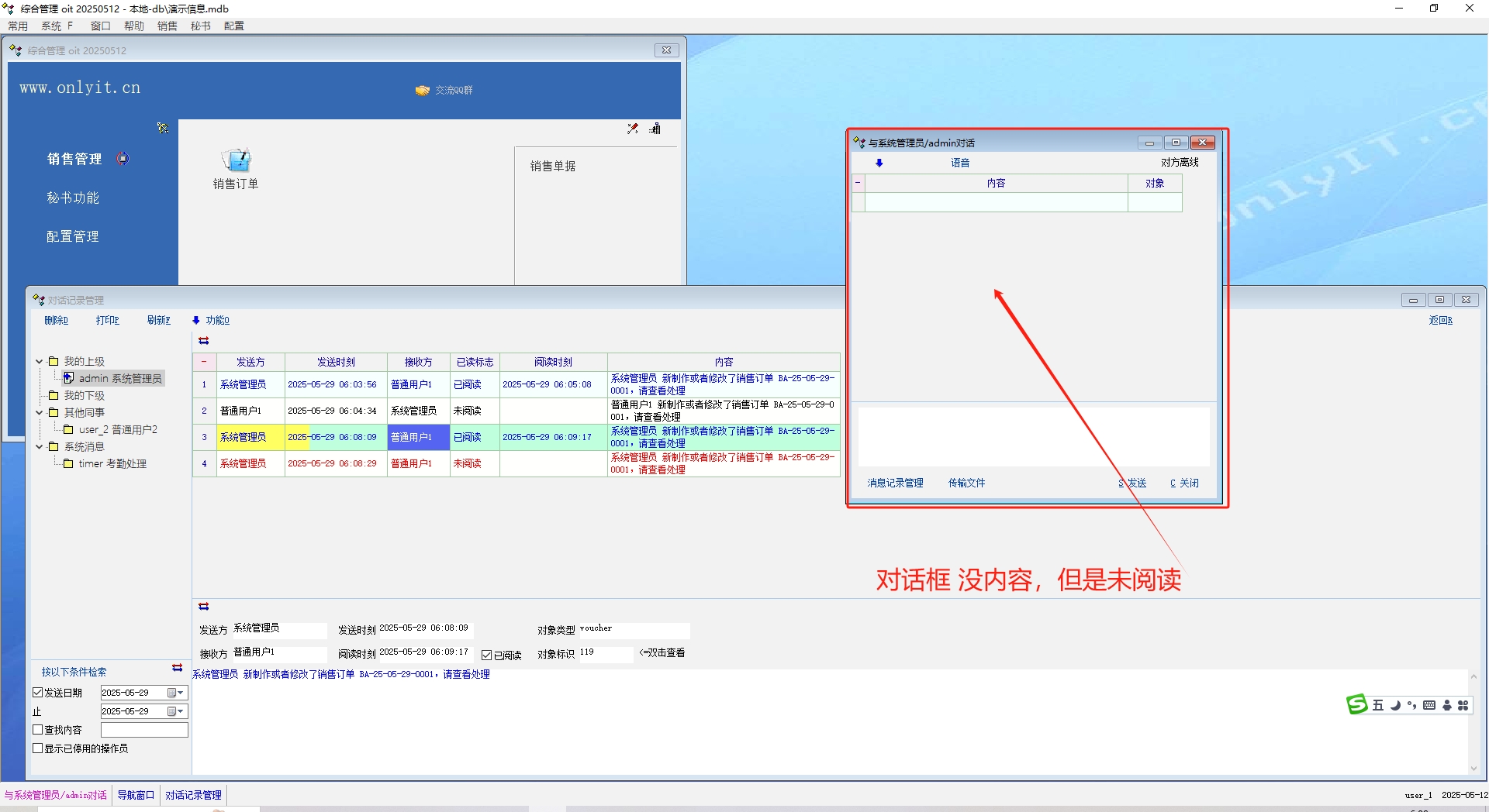我追踪oit的sql,发现是系统bug,里面的 recv_user_id 被固定写成admin了,不是登录账号 select msg_id,line_id,msg_info,recv_user_id,send_user_id,send_time,read_time,obj_type,obj_id,readed_flag,send_delete_flag,recv_delete_flag from tbx_chat where send_user_id = 'system' and recv_user_id = 'admin' and (readed_flag <> 'Y' or readed_flag is null) order by msg_id,line_id |