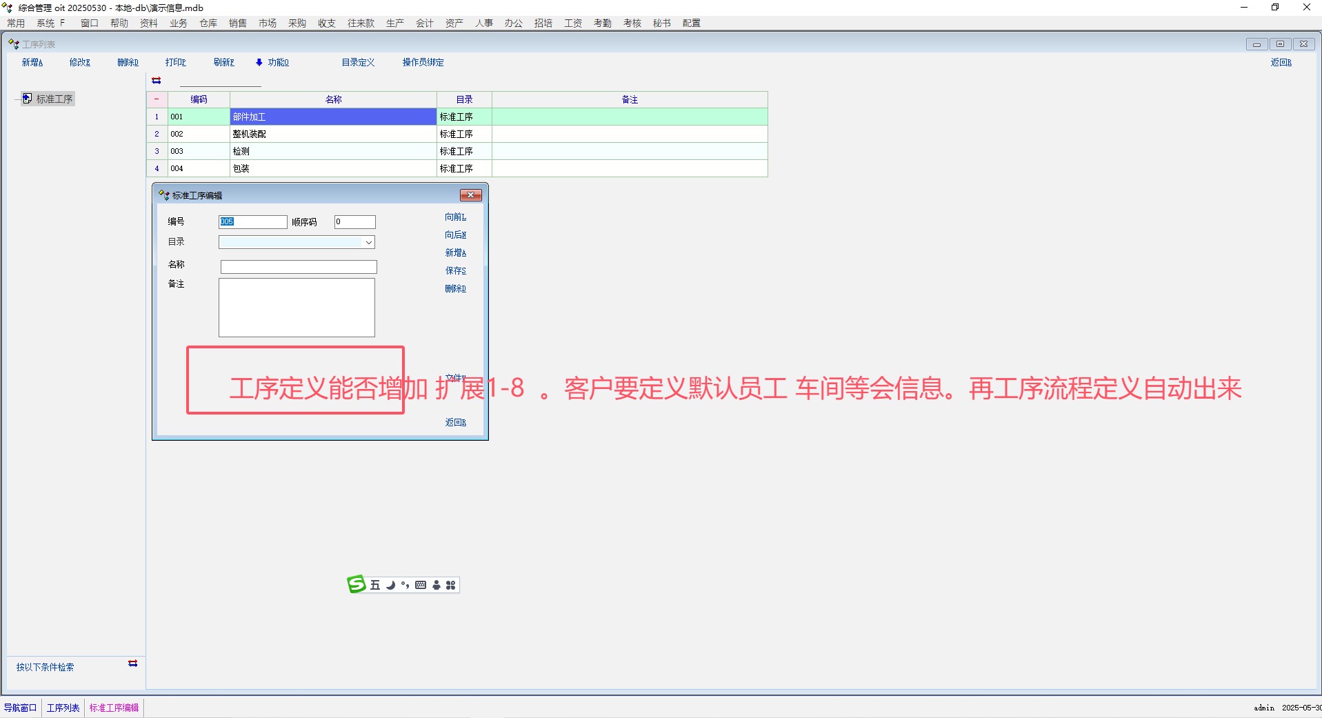 工序定义能否增加扩展1-8。客户要定义默认员工车间等会信息,工序流程定义自动出来。