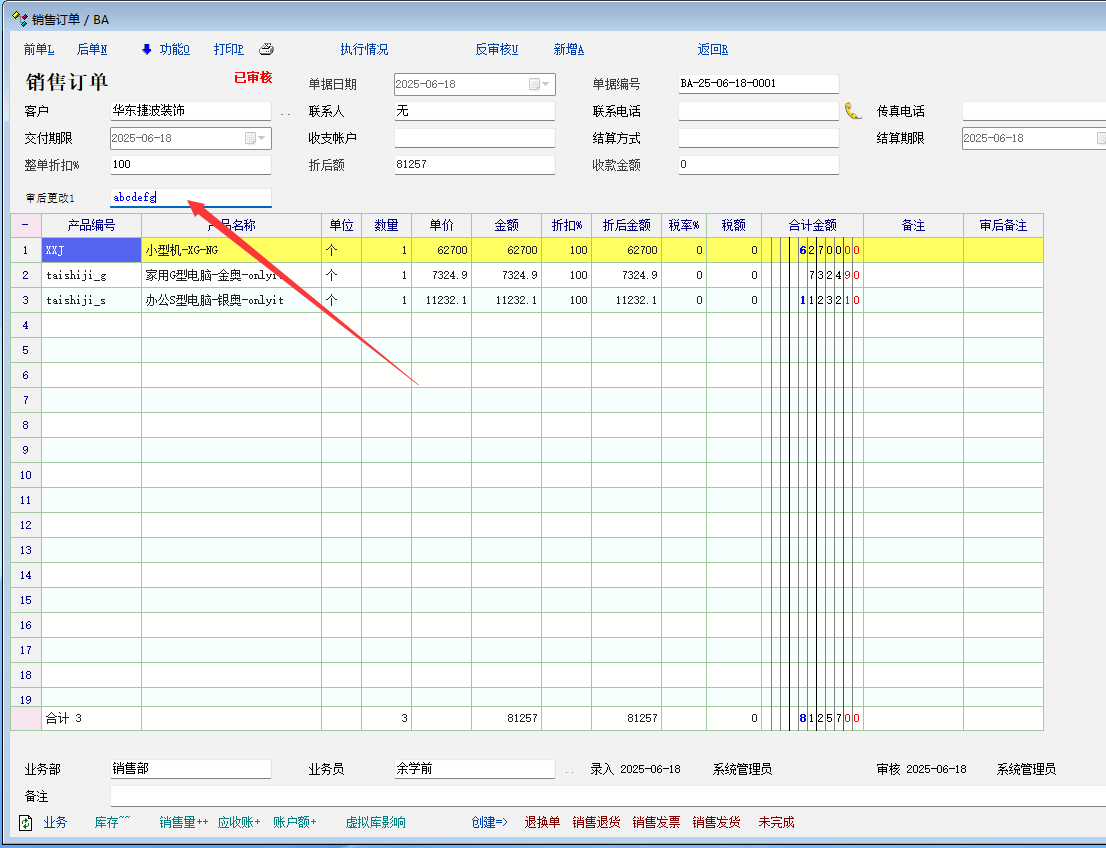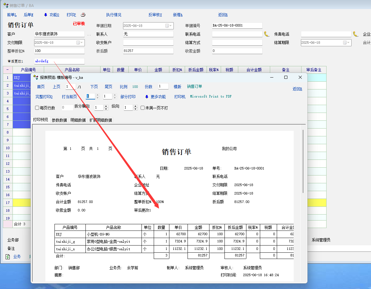 业务场景: 有时候单据审核后, 允许直接修改一些不重要的字段, 这时候打印, 内容不会带入打印模板中. 必须重新打开单据 操作步骤: 1. 打开已经审核的单据 2. 修改审后允许修改的表头属性 3. 点击打印(有问题, 刚修改的内容不会传入打印模板中) 4. 必须重新打印单据 , 再打印, 才会有步骤2中的内容. 详细看图 |