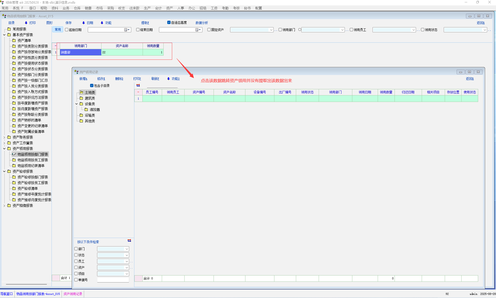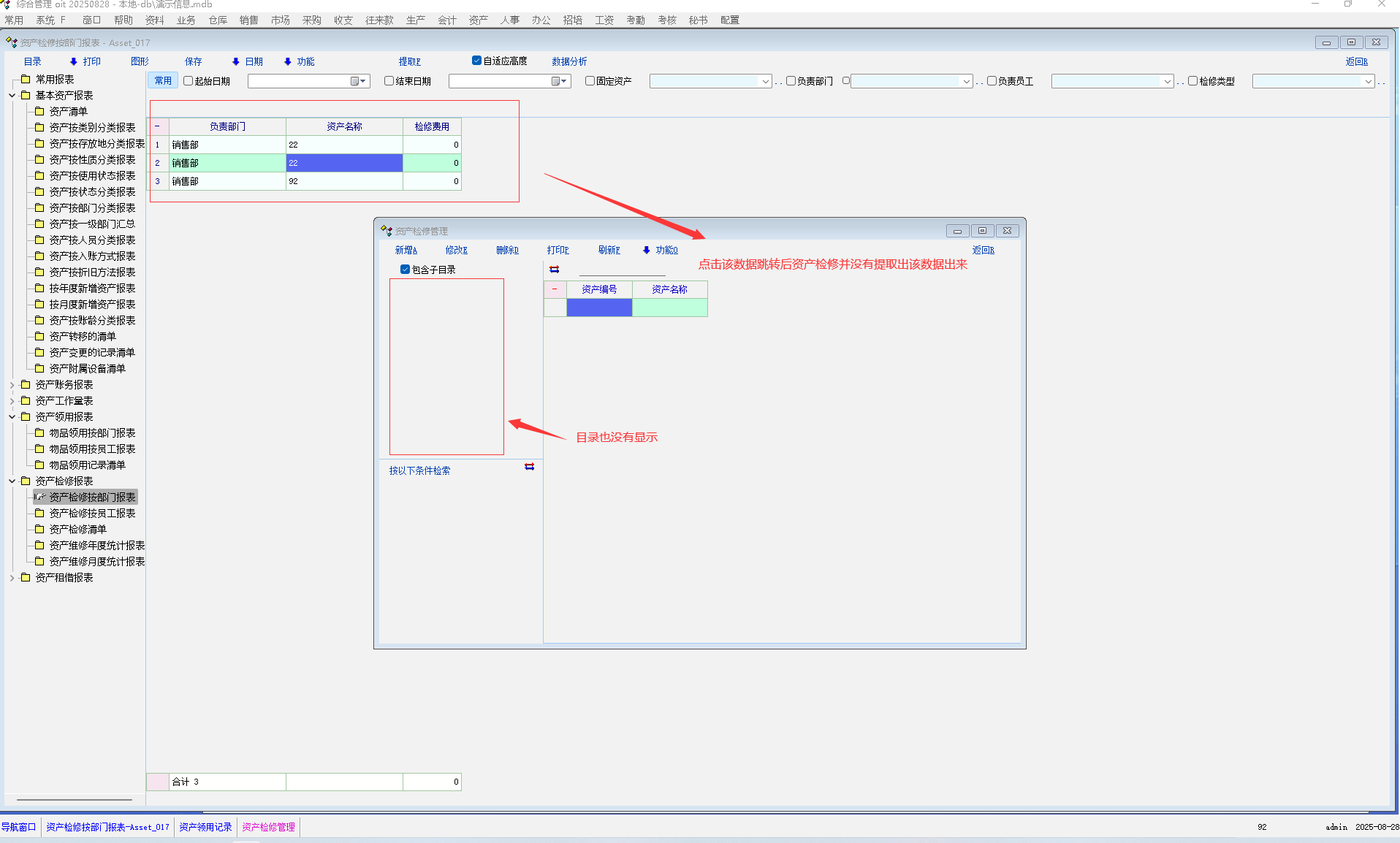 1:物品检修按部门/员工报表提取数据后点击数据跳转异常,且跳转后资产检修目录/检索条件无法显示