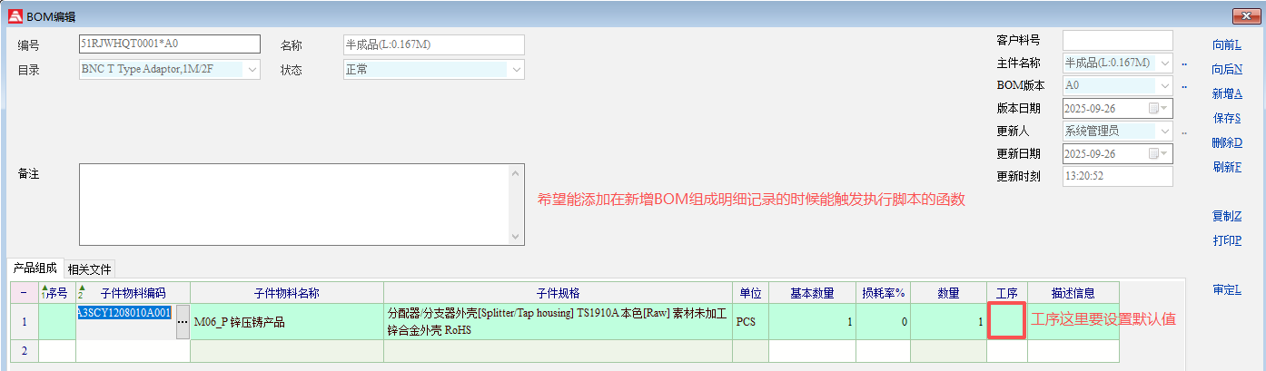 老师,客户希望能给BOM组成明细设置默认工序,目前没有BOM组成明细编辑的触发执行脚本的函数,希望可以添加,谢谢!