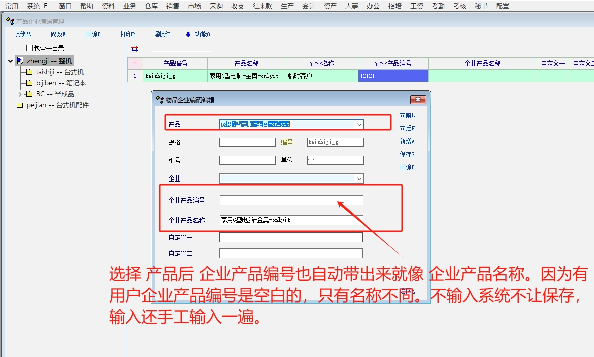 选择 产品后 企业产品编号也自动带出来就像 企业产品名称。因为有用户企业产品编号是空白的,只有名称不。不输入系统不让保存输入还手工输入一遍。