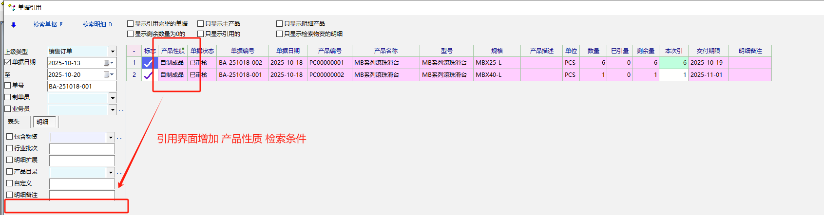 单据引用界面 检索条件增加 产品性质 条件