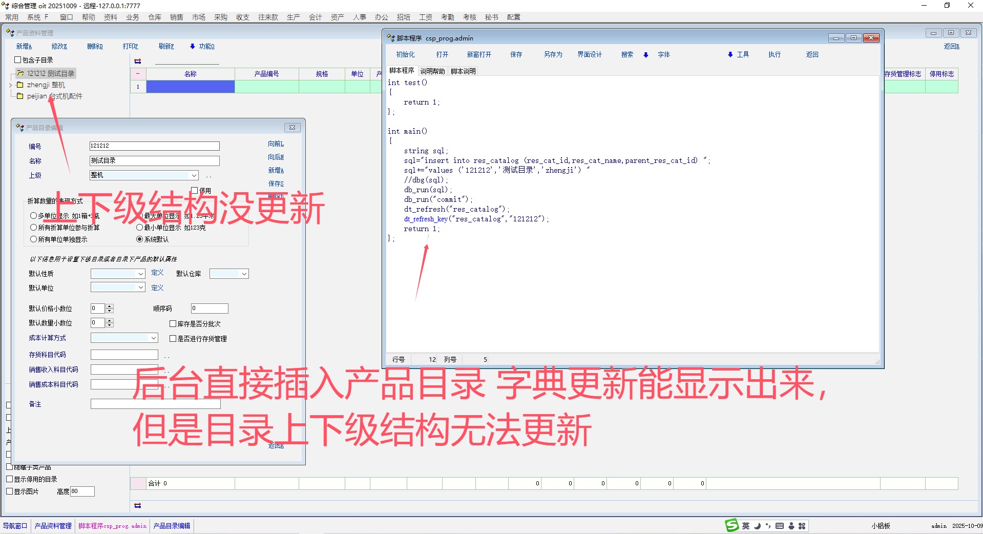 后台直接插入产品目录后,有上下级有关系信息无法刷新!