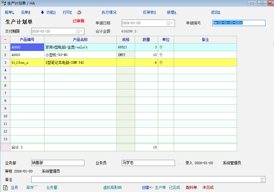 生成《生产计划单》,计划单上有多个产品。