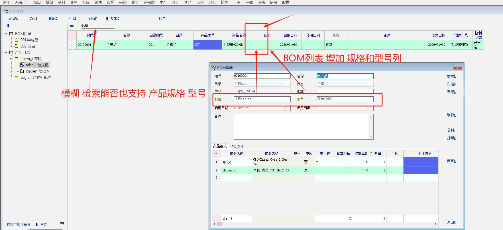 BOM列表 增加 产品规格 型号。 模糊检索也支持产品规格型号。