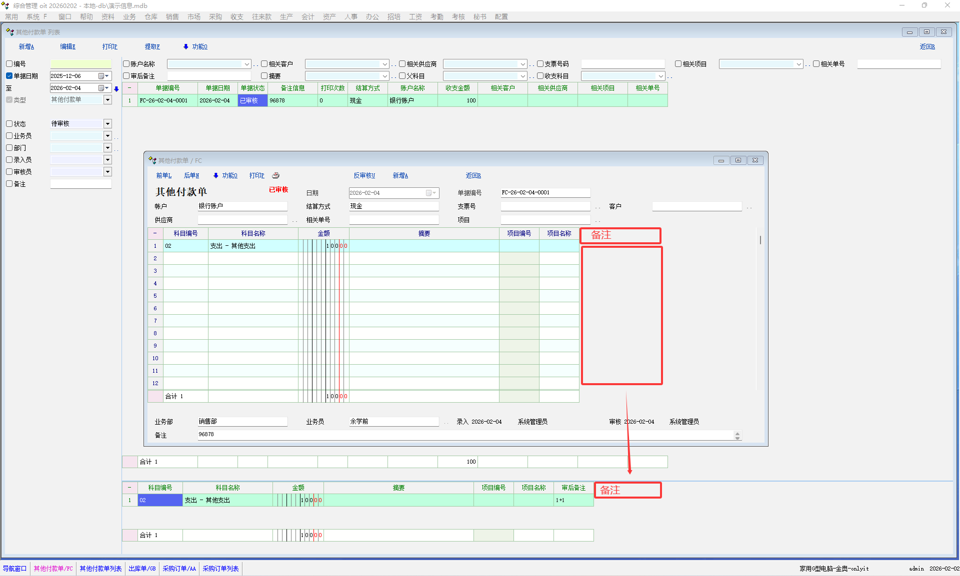 建议其它收付款,往来款单据明细列表里增加备注列