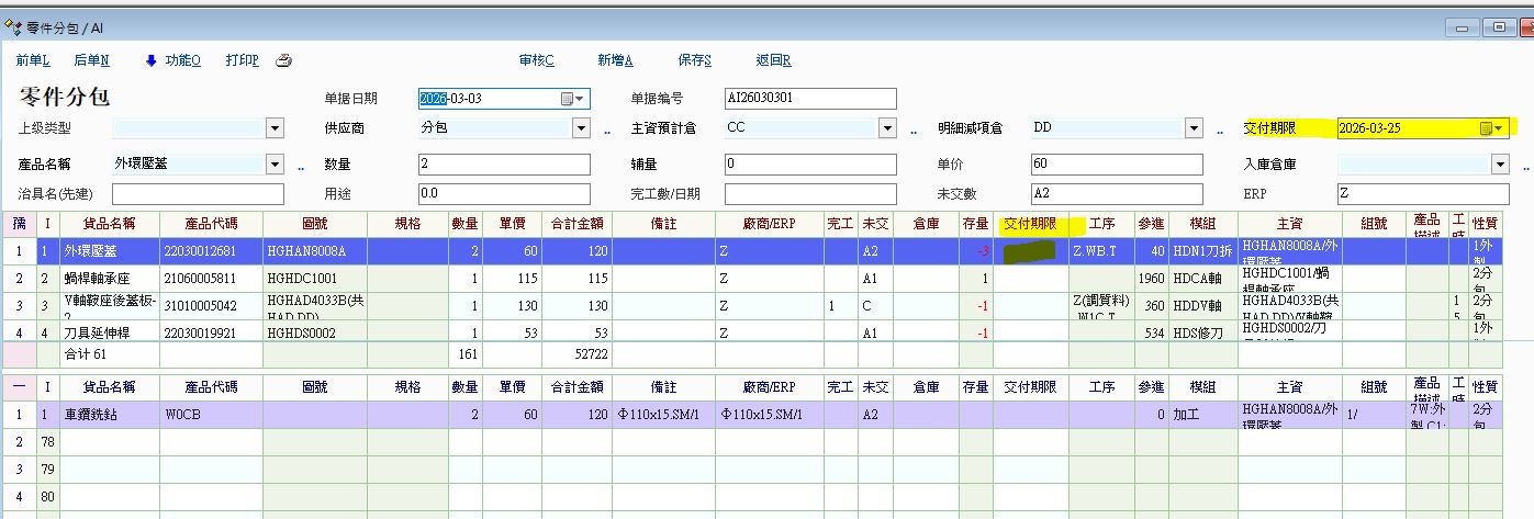 如圖例,多筆主物資表頭的交付日期,以前可分別異動修改,