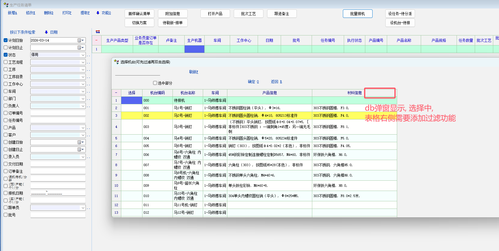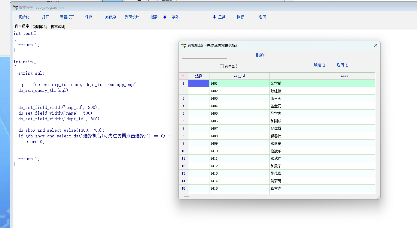 int main() { string sql; sql = "select emp_id, name, dept_id from app_emp"; db_run_query_thr(sql); db_set_field_width('emp_id', 200); db_set_field_width('name', 500); db_set_field_width('dept_id', 600); db_show_and_select_wsize(1300, 700); if (db_show_and_select_ds('选择机台(可先过滤再双击选择)') == 0) { return 0; } return 1; }; 问题1: 弹窗中的dept_id列, 是不支持筛选过滤的. 问题2: db_show_and_select_wsize 这个函数, 是没办法改变窗口的大小的. 每次都要去拉动窗口大小. 这个设置的是表格的宽和高, 窗口大小没有达到1300和700. 有个帖子孟老师说没看明白. 执行一下就能明白了. |