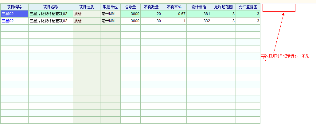 三、我要记录几个实测值,于是在明细定制里勾选“记录流水”,里面天上几个实测值,但是我下一次打开时,“”记录流水“栏又消失了,连我填过的数据都消失了。为什么我勾选过的定制的明细会在下一次打开时消失不显示了?