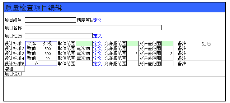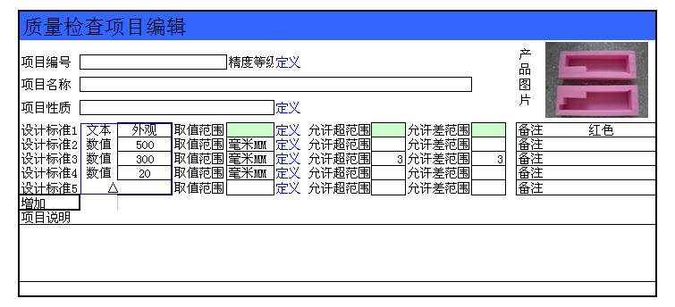 使用软件进行管理的最大好处是快捷、方便,但是现有的质检项目和单据,每次只能引索一个“设计标准”太慢了,这样工作的话,要知道每个产品最少都有3个规格数据啊,长、宽、厚,有些很多内部尺寸的。