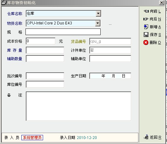 如果物品数量很多 而又不支持物品编号 那么物资的初始会相当的麻烦 通过编号找物资比通过名称找物资 容易多了 希望老师能改进一下 |