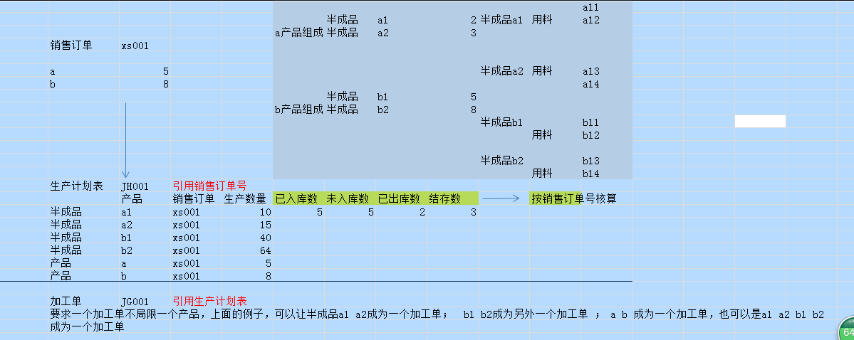 生产计划表里应该把生产产品组成也列上去(除原料),如生产A产品需要用先生产半成品A1和A2,那么A1和A2也要列到生产计划里,另外,加工单支持多款产品,如A1 A2共用一张加工单,详细举例如附件