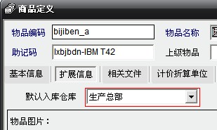 2、设定物资的扩展属性:默认入库仓库如下图2;