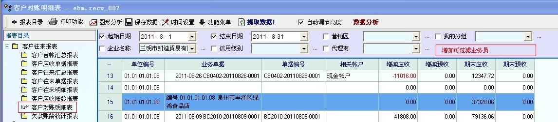 在使用过程中,月终或一定周期,业务内勤需打印对帐明细与业务员进行核对销售数据,但在该报表页面,过滤条件太少,虽可以使用分组过滤,但比较麻烦,建议直接增加部门和业务员过滤方式,业务内勤每次核对时,只需要选择哪个业务员,并选择好时间段,即可打印所需的内容出来。。。方便多了,又不会造成不必条的纸张浪费。。请老师予以考虑,谢谢