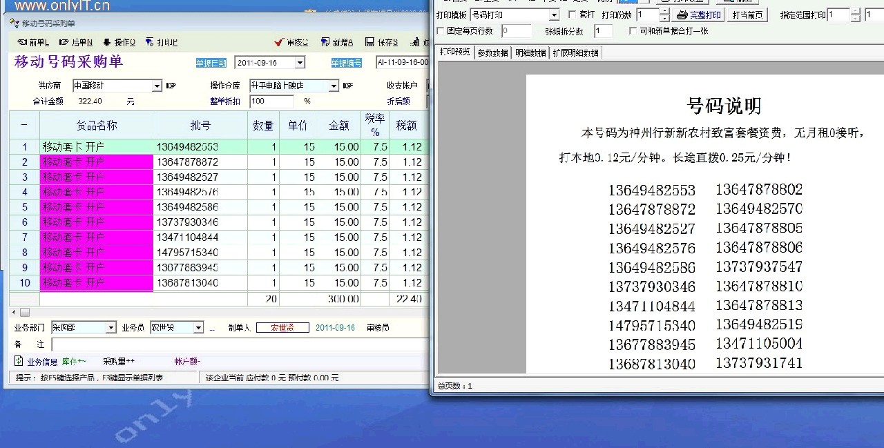 本人用于打印销售移动公司套卡,用批次表示号码