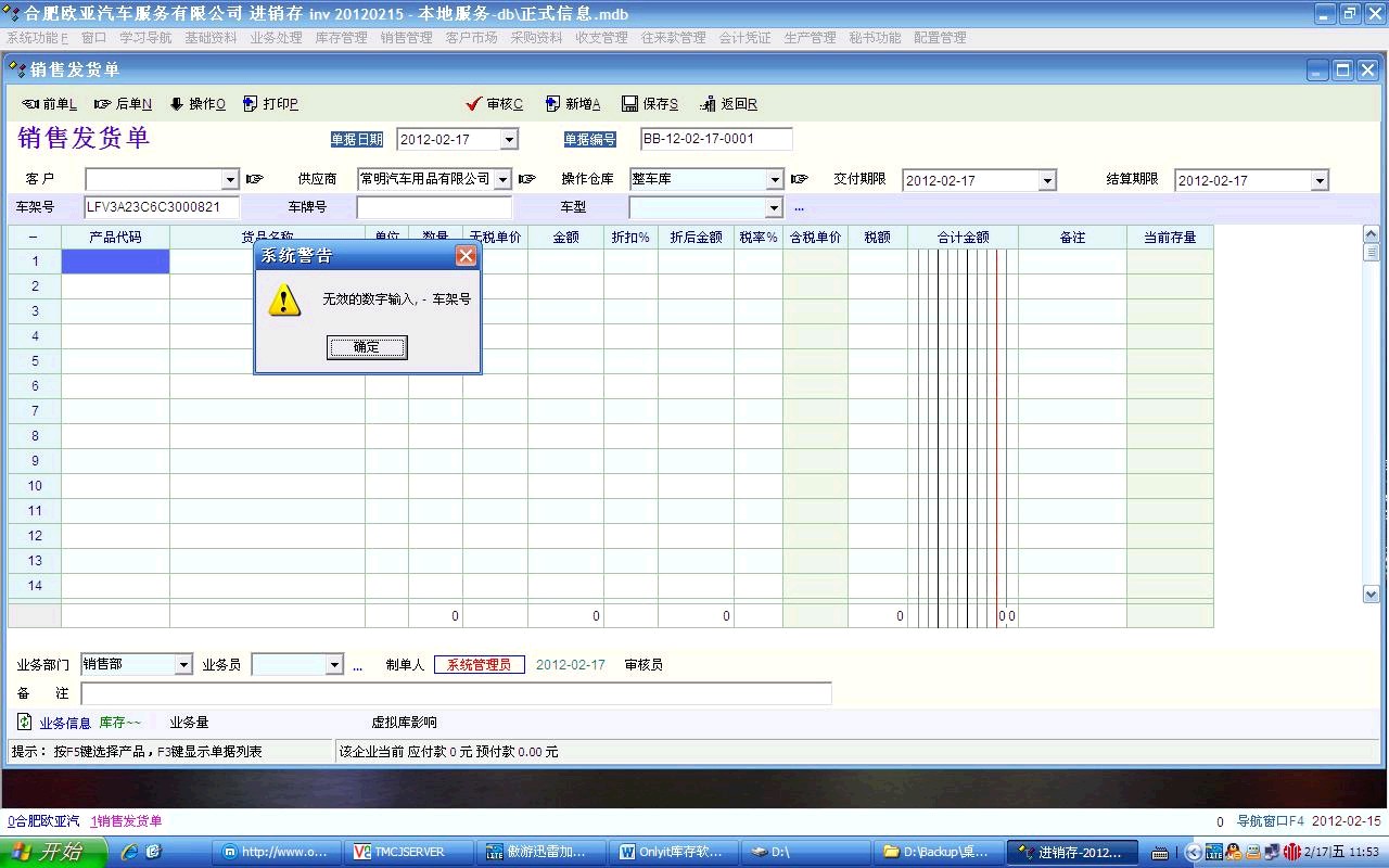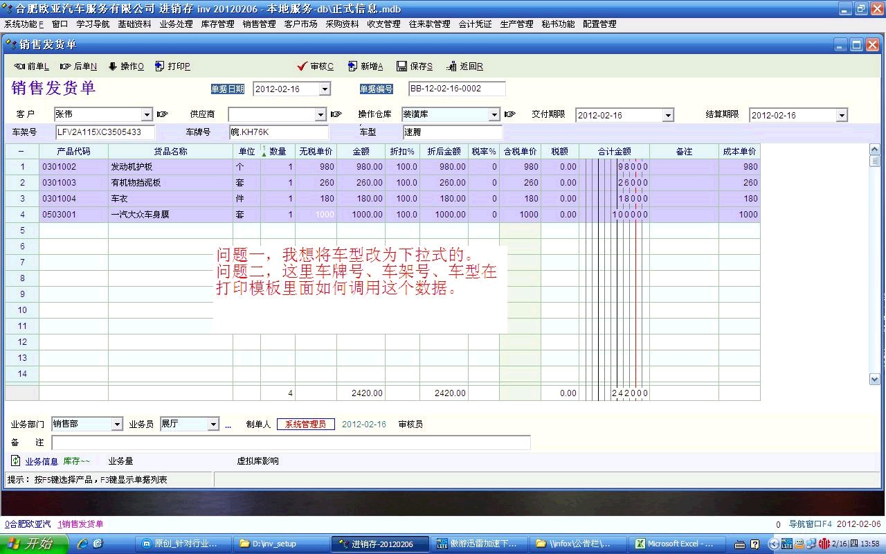如單據表頭想增加一些內容,我的設定如下: 1.點選"操作"->參數及配置->單據對象屬性擴展, 屬性編碼設"01",屬性名稱設"車架號",類型設"整型". 按確定重啟後.在單據表頭中即可看到車架號的欄位可自行輸入資料. 2.按"F3"後,左邊檢索條件,中間會有一欄"車架號",即可輸入資料作搜尋. |