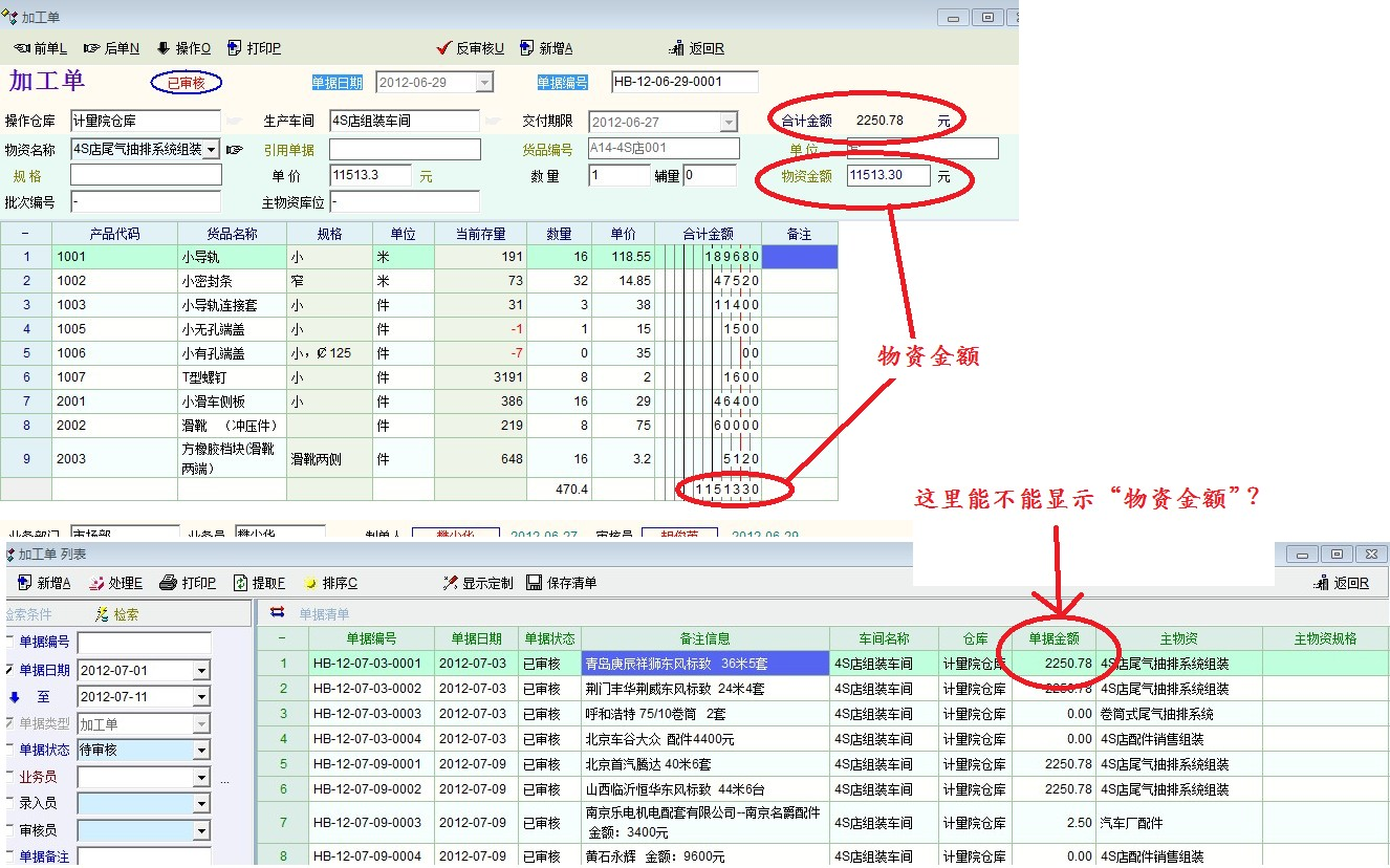 求助_谁能帮我把“加工单列表”中增加“物资金额”?谢谢大家!_产供销