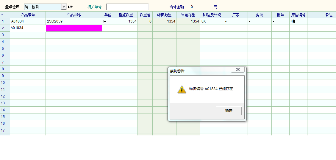 但不知版主有没有试过在同一张盘点单上多次输入同一个产品(同一个物资编号)有没有,系统每次都会出现该物资编号已经存在的提示,要重复操作一次才可以输入。同时还有一个问题是在第二行输入该物资数量后总是自动归零,要重复输入数量,好麻烦。