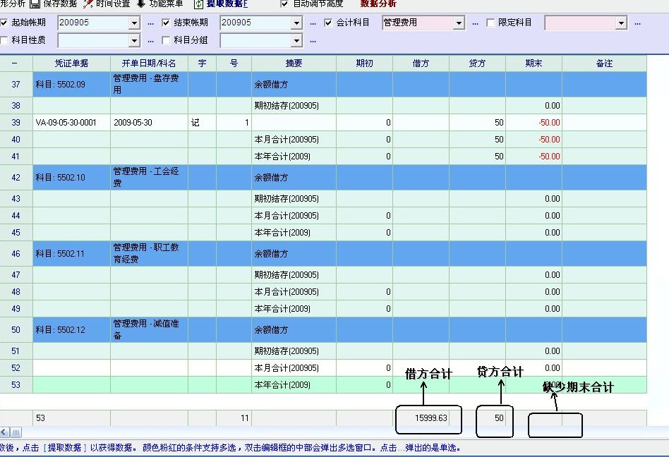 目前明细分类账和多栏明细账都有总账科目的合计项,但在使用过程中发现,合计项只显示总账科目的借贷方发生额的合计数而不能显示期末余额的合计数。以管理费用为例,管理费用下包含多个明细科目,当在明细分类账选择管理费用科目时,查询结果可以显示管理费用下各个明细科目的借贷方发生额及期末余额以及总账科目的借贷方发生额合计数,但不能显示期末余额的合计数。要想知道管理费用科目本身的期末余额就必须再去时查询总分类账。这样不太方便,希望以后能增加上期末余额的合计数。
