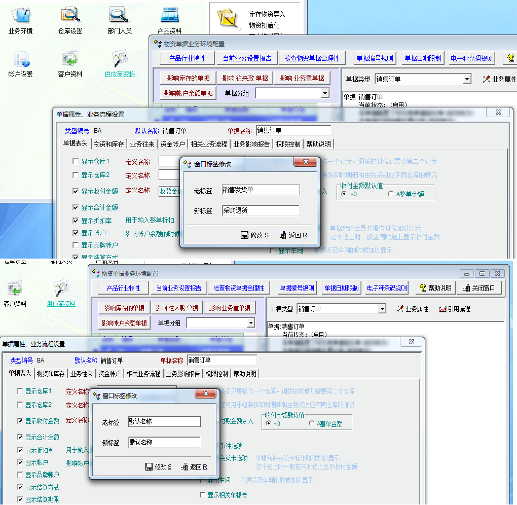 在基础管理----业务环境-----业务属性中,默认单据名称修改----老标签始终为销售发货单?其它标签修改,都是点啥是啥如下图所示: