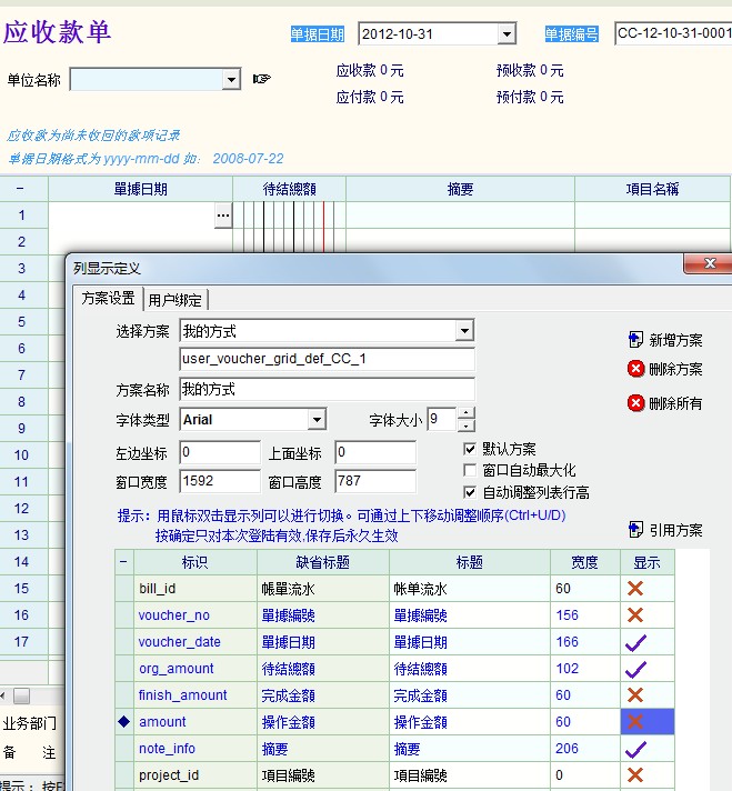 预收付款单调整好合适的大小后显示定制保存,这2个单据没有明细,因此只对大小产生作用。