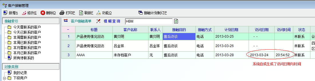 客户管理中,通过客户联系这个选项卡制定一个客户接触访谈计划,如图1。然后在导航界面中通过客户联系或客户接触这两功能打开查看所有待联系的客户,却发现系统中自动生成了访问时期与时间,如图2,个人觉得非常不合理!!!