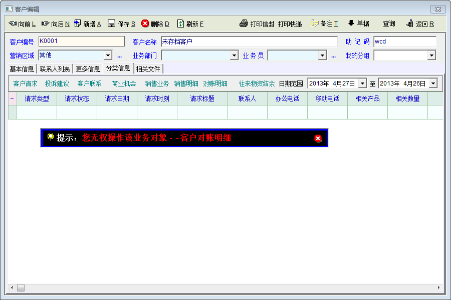客户编辑中往来物资结余一项同样无法授权