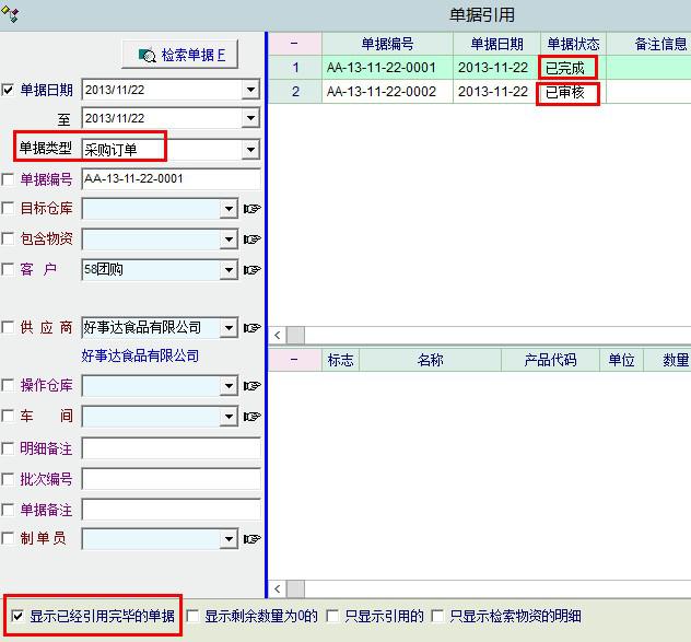 三、显示已经引用的单据 ,这个复选框,有没有选都不起使用【条件:在入库单 删除采购收货,而直接把 采购订单  下级 做为 入库单】,原先未删除之前,有做过一个单据,这个应该是bug
