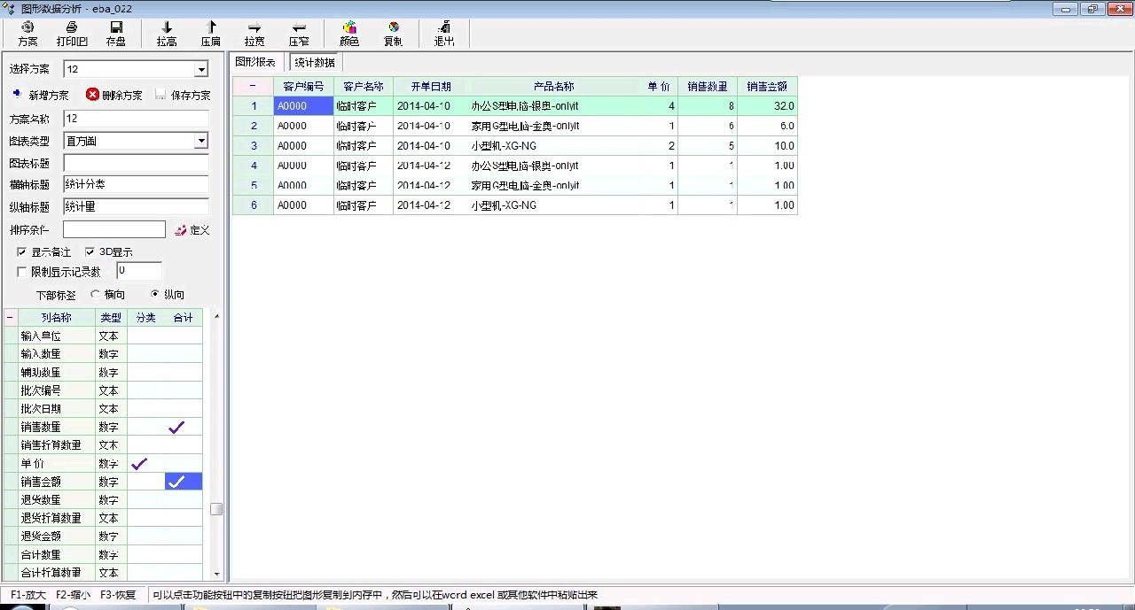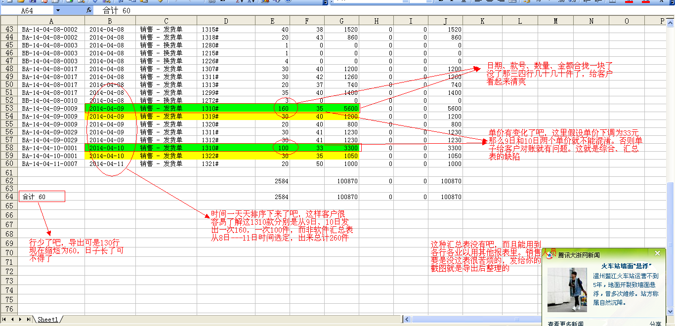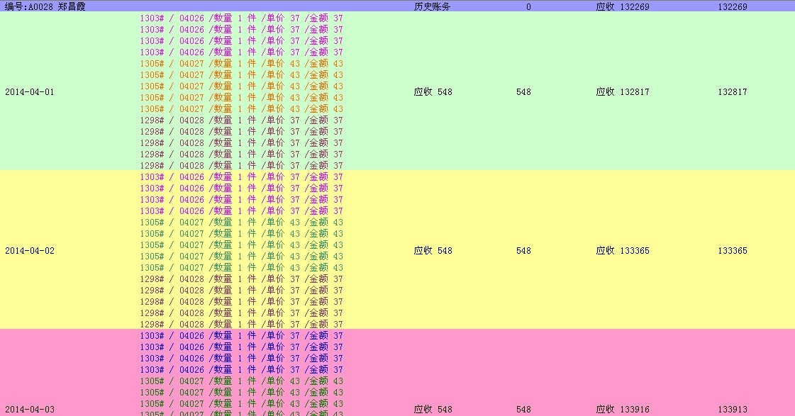 不是啊,是不是我说不清楚,要的是一种日期从1日始到月尾,每天每款多单合计为同一种款式的合计数量、金额,比如我A款式1日发了1单,各种颜色合计18件,乘以单价,总金额。2号我A 款式又给这客户发了3单,合计三单为15+23+47=85件,这表排列应是 1日,A款,18,X20,=360 2日,A款,85,X20,=1700(这行数实为三单同日合计来的) 2日,B款,30,X15,=450 把单据相关物资这列隐藏掉,就看不见什么款式了,只见到金额,而且这种表用途很广的,其他的软件都有 |
