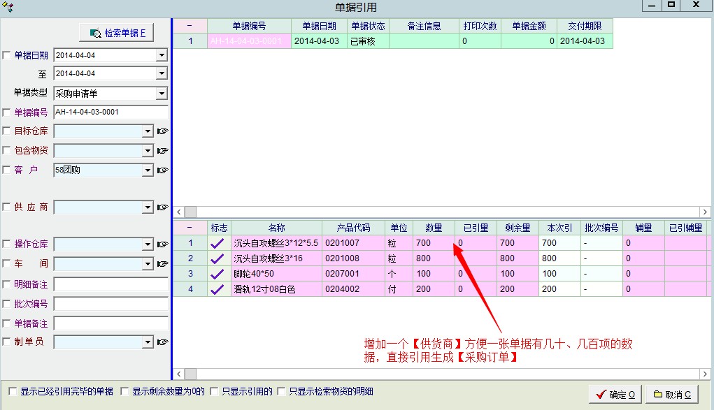 还有【生产计划】或【销售订单】有时生成的采购需要也是好几十项或上百项,能在这个图里,加一个【供货商】再好不够的