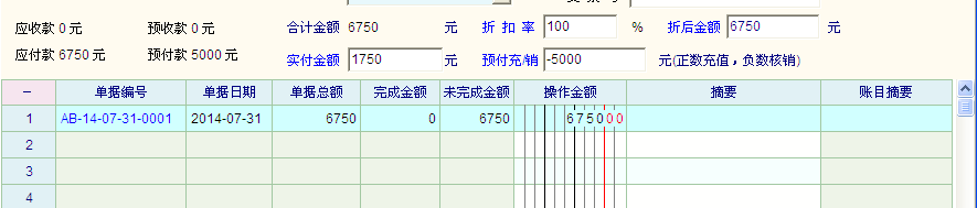 在预付充/销 那里输入 预付款的负数,比如之前预付了5000,就填“-5000”