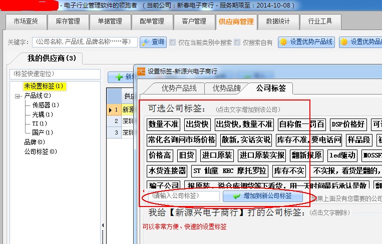 如果可以的话,最好是给供应商或客户增添一个快速标签设置功能,最近看的几个管理软件及平时使用的一些记事软件如印象笔记等标签设置功能都是必备的一项功能,使用标签功能,可以非常快捷的对关键词,某一方面的关注重点进行精准的搜索、定位,期盼老师可以多参考其它一些软件的优点。