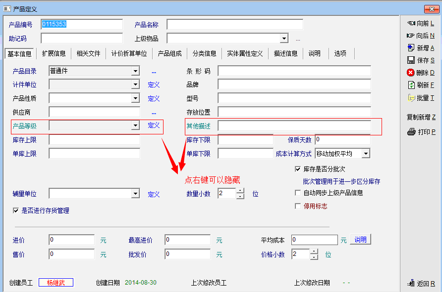 在产品资料定义的时候,由于我们一些小的应用,许多项目用不上,能否自定义,将不需要的项目隐藏起来呢!也就是增加像单据列那样的显示定制功能!