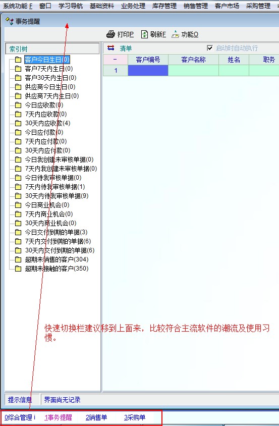 建议老师将快速切换栏移到窗口上部。纵观现在的主流软件的快速切换栏似乎都是在窗口上方的:浏览器、OFFICE、WPS等等都是如此,那么多的大软件的快速切换栏都设置在窗口上方,应该是有经过最科学的严谨调研而做出的最合理安排,而且用户基本上都已经习惯在窗口上方进行窗口切换,所以建议我们的软件也将快速切换栏移到窗口上方。