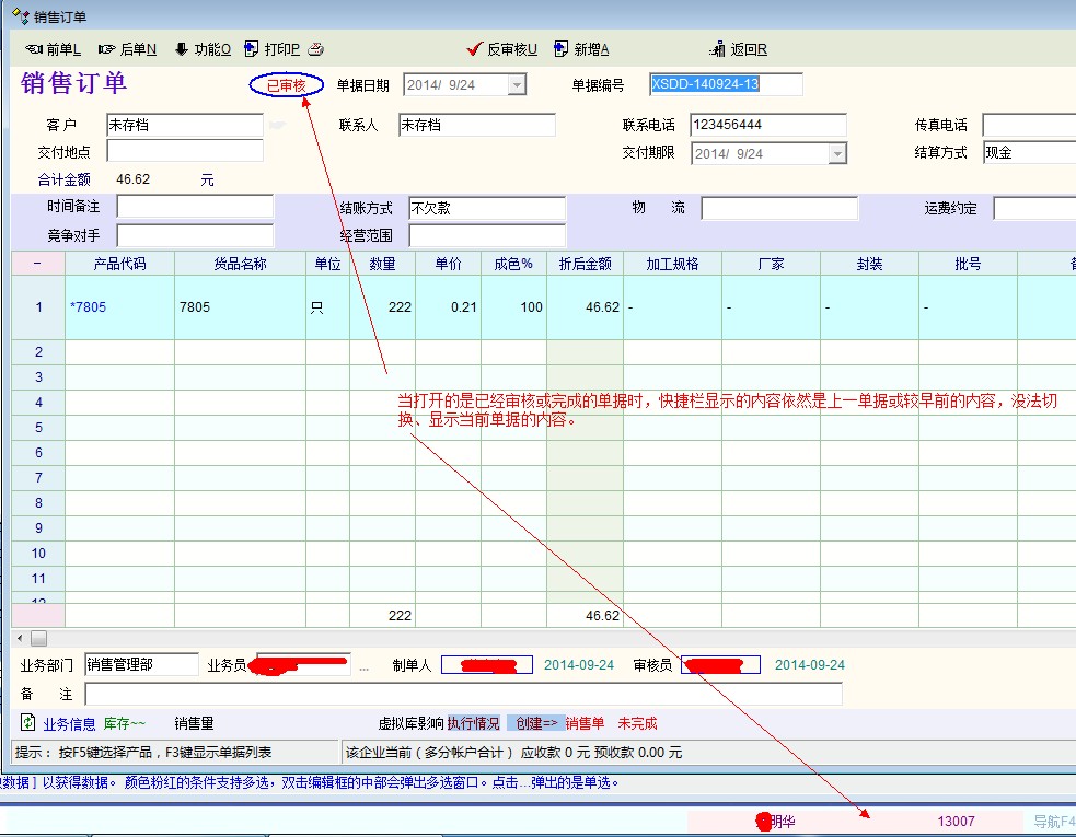 当打开的是已经审核或完成的单据时,主窗口快捷打开基础资料信息显示的仍是上一单据或较早的内容,没法切换、显示当前内容!
