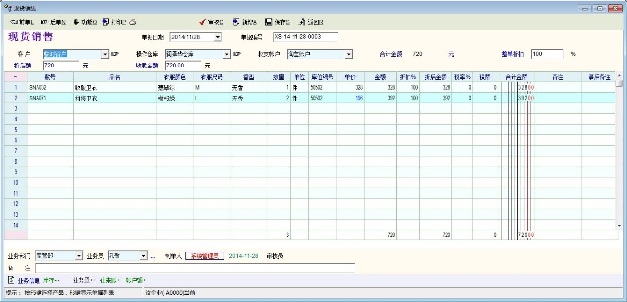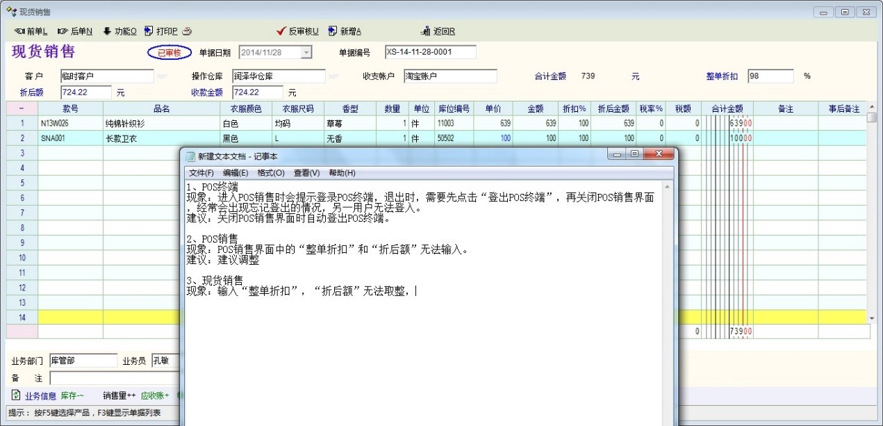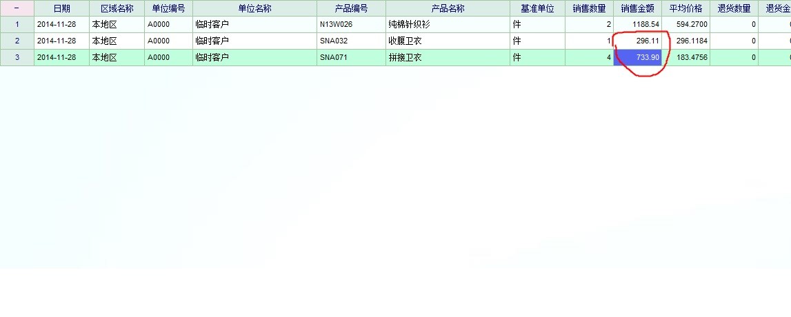现象:直接输入“折后额”后,在销售报表中统计金额合计与实现不一致,如图2图3图4,图2+图3是单